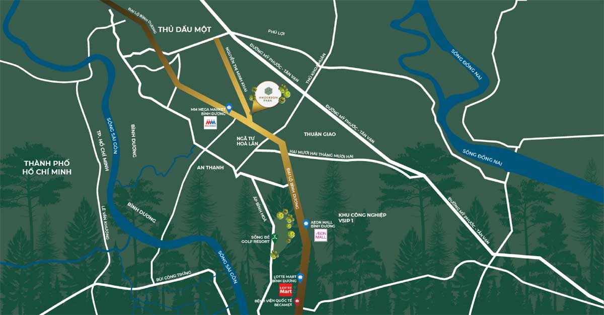 - Sở hữu vị trí đắc địa, cực kỳ giới hạn; nằm nay trục đường giao thương huyết mạch trọng điểm kết nối với thành phố Hồ Chí Minh, căn hộ Anderson Park Bình Dương được thùa hưởng trọng vẹn sự phát trienr vượt bậc về cơ sở hạ tầng giao thông, hạ tầng tiện ích như: Trung tâm thương mại Aeon Mall, Khu công nghiệp VSIP 1, sân Golf Sông Bé,… hứa hẹn sẽ góp phần gia tăng cuộc sống phong phú cho cộng đồng cư dân.