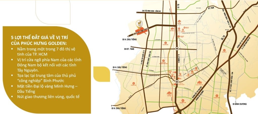 - Phúc Hưng Golden nằm tại mặt tiền đại lộ Minh Hưng và liền kề tuyến đường phía Tây quốc lộ 13 (đang xây dựng). Từ dự án dễ dàng di chuyển và kết nối với nhiều địa điểm trong khu vực và của tỉnh Bình Phước.