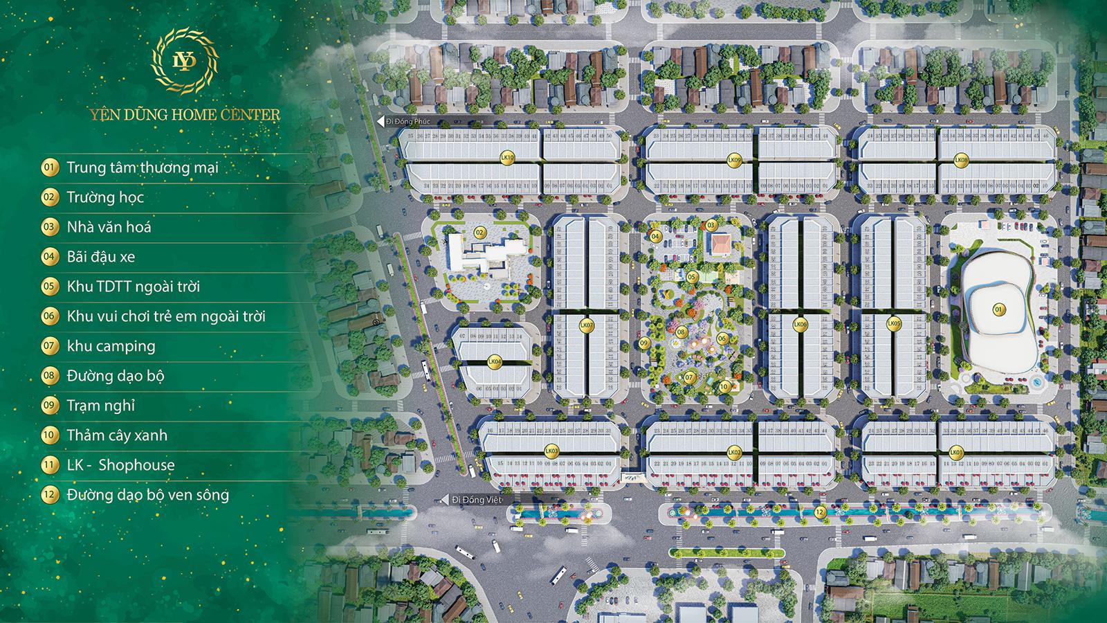 Dự án Yên Dũng Home Center được quy hoạch dựa trên cấu trúc truyền thống và lâu đời của vùng đất Bắc Giang bao quanh bởi màu xanh và núi đồi. Là khu đô thị: Hiện đại – Đồng bộ - Sinh thái – Đa chức năng”. Sự khác biệt và độc đáo của dự án so với các dự án khác chính là xây dựng hình ảnh khu đô thị sinh thái, với diện tích cây xanh và mặt nước rất lớn trong khi mật độ xây dụng lại thấp. Đây chính là xu hướng sống mới trên thế giới và bắt nhịp với nhu cầu thực tế của Việt Nam.