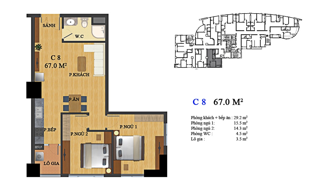 - Diện tích các căn hộ: từ 45m2 đến 128m2