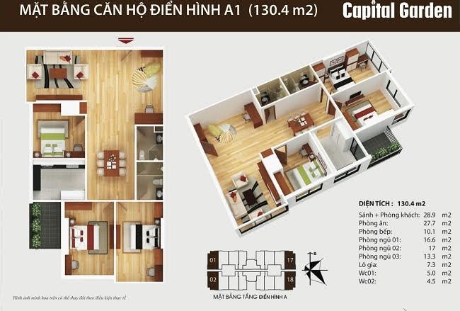 - The Capital Garden với 25 tầng căn hộ, 1 tầng trung tâm thương mại và văn phòng, 3 tầng hầm, 1 tầng cây xanh và tiện ích. Tòa nhà được thiết kế với hệ thống phòng tập đa năng rộng lớn, được trang bị đầy đủ máy móc và trang thiết bị hiện đại, Trung tâm thể dục thể thao của Capital Garden mang đến cho cư dân những không gian luyện tập tiện nghi và thoải mái. Sau những giờ luyện tập với cường độ lớn, cư dân của Capital Garden có thể thả mình sảng khoái trong bể bơi bốn mùa hiện đại hay thư giãn để “làm mới” lại mình tại khu massage và spa đẳng cấp.