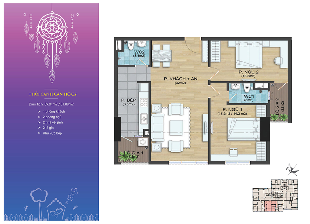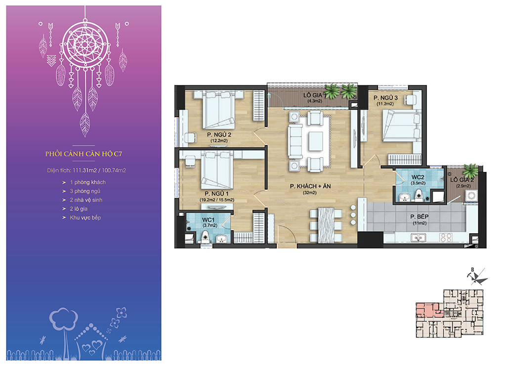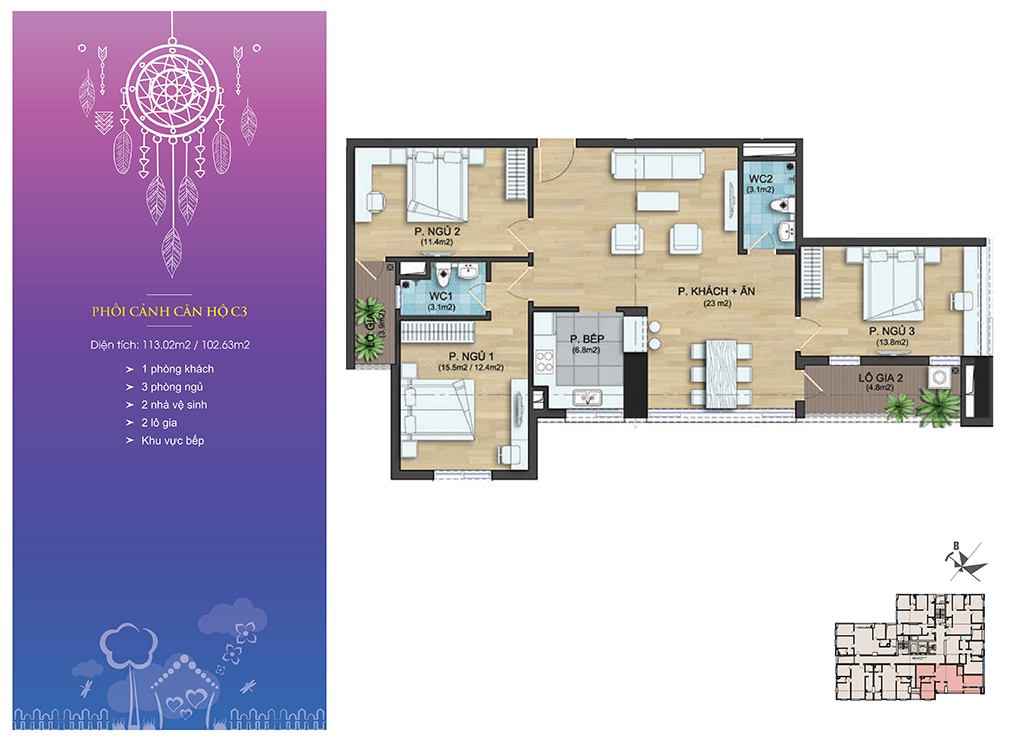 - Thiết kế: 2 đến 3 phòng ngủ.
