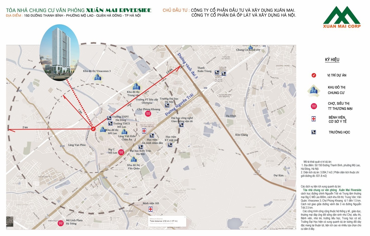 - Xuân mai Riverside nằm tại số 150 đường Thanh Bình thuộc Phường Mỗ Lao, Quận Hà Đông. Kế bên là KĐT Văn Quán và các khu chung cư cao cấp khác như Fodacon Bắc Hà, Hồ Gươm Plaza, Westa ...