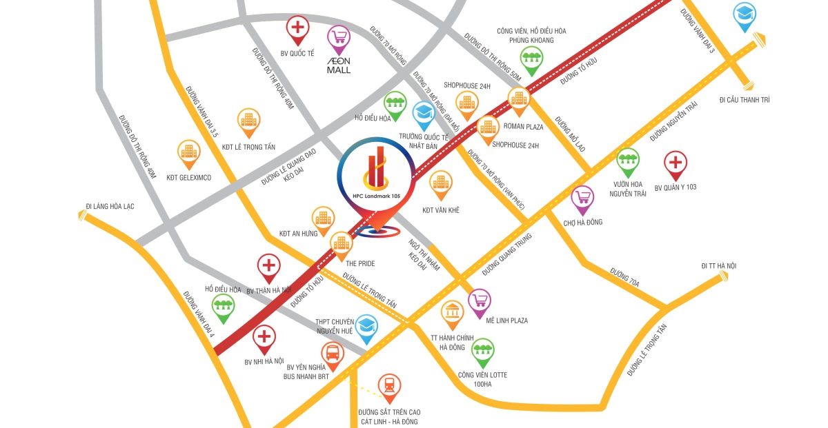 - Không nằm ở trung tâm thành phố, không lọt giữa những tuyến đường đông đúc nhất tại Hà Nội nên HPC Landmark 105 giúp cho mỗi cư dẫn trải nghiệm một không gian nghỉ ngơi thật sự sau giờ làm việc.Nhưng không vì thế mà việc di chuyển từ HPC không thuận lợi. Dự án nằm ngay đầu cửa ngõ của địa phận Thủ đô, kết nối trực tiếp với các tuyến giao thông huyết mạch như: tuyến bus BRT, đường Lê Trọng Tấn, Lê Văn Lương , Vành đai 3, đường sắt trên cao Cát Linh - Hà Đông,...di chuyển vào trung tâm Hà Nội chỉ mất 5 phút lái xe.Được coi là một trong những vị trí vàng cuối cùng tại Thủ đô