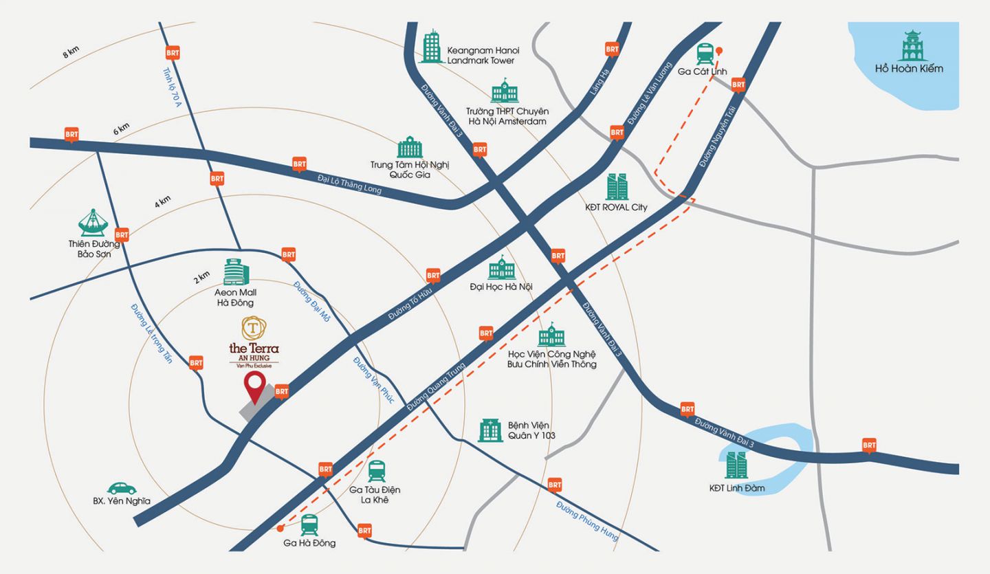 - Nhiều người trẻ có xu hướng lựa chọn “ly tâm" ra khu cận trung tâm để chọn chốn an cư. Nằm tại cửa ngõ Khu đô thị An Hưng, ngay mặt đường Tố Hữu, từ The Terra - An Hưng, cư dân có thể dễ dàng di chuyển đến trung tâm Hà Nội thông qua các tuyến đường lớn Tố Hữu, Lê Văn Lương. Bên cạnh đó còn tiếp cận nhanh chóng đến hệ thống hạ tầng giao thông hiện đại của khu vực như chỉ mất 2 phút đến bến xe bus nhanh BRT, 6 phút đến ga tàu điện La Khê, đồng thời kết nối đến nhiều vị trí quan trọng khác trong thành phố. Đặc biệt, mới đây Hà Nội đầu tư gần 700 tỷ xây hầm chui Lê Văn Lương - Vành đai 3,việc kết nối từ phía Tây thủ đô vào trung tâm thành phố cũng trở nên dễ dàng hơn.